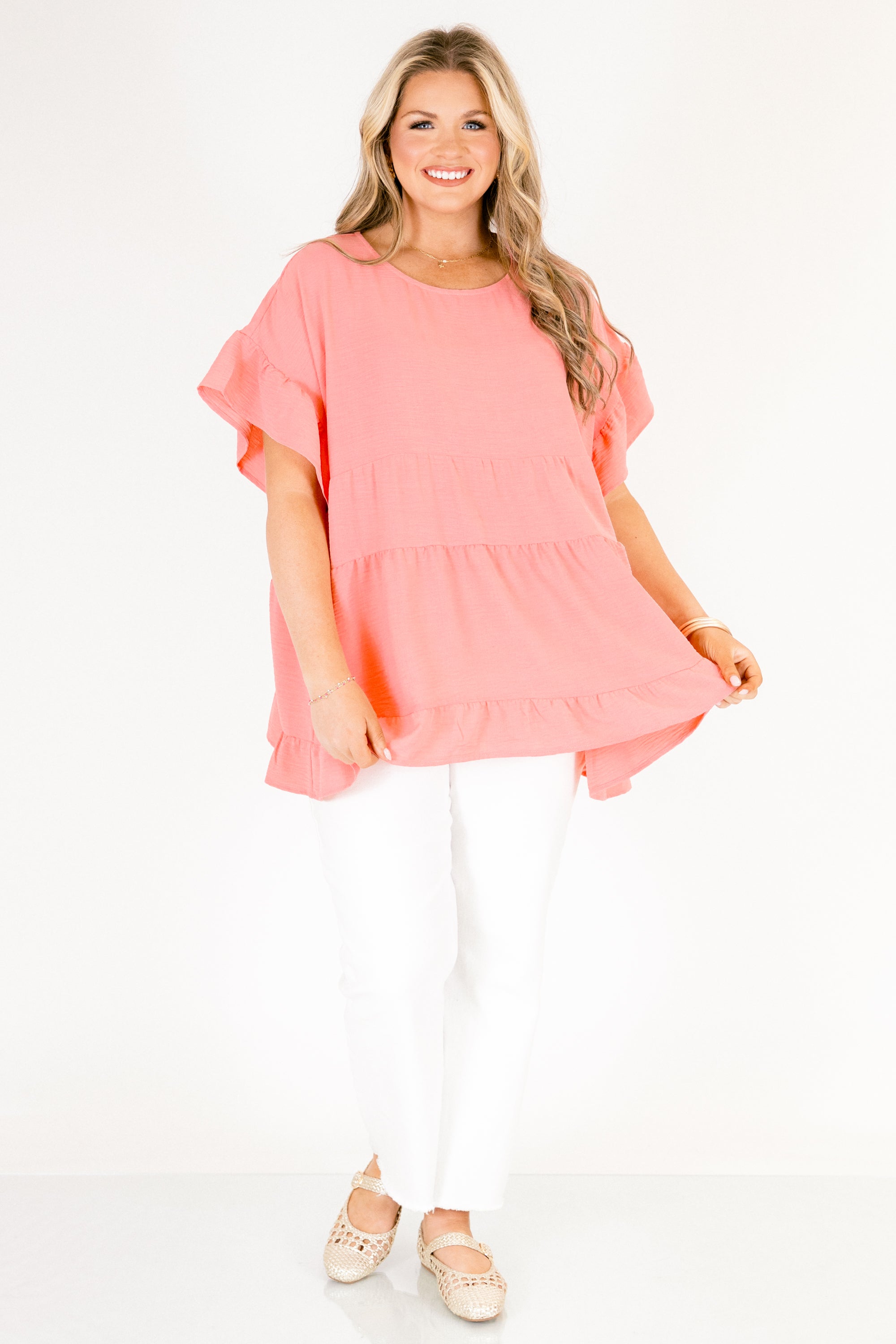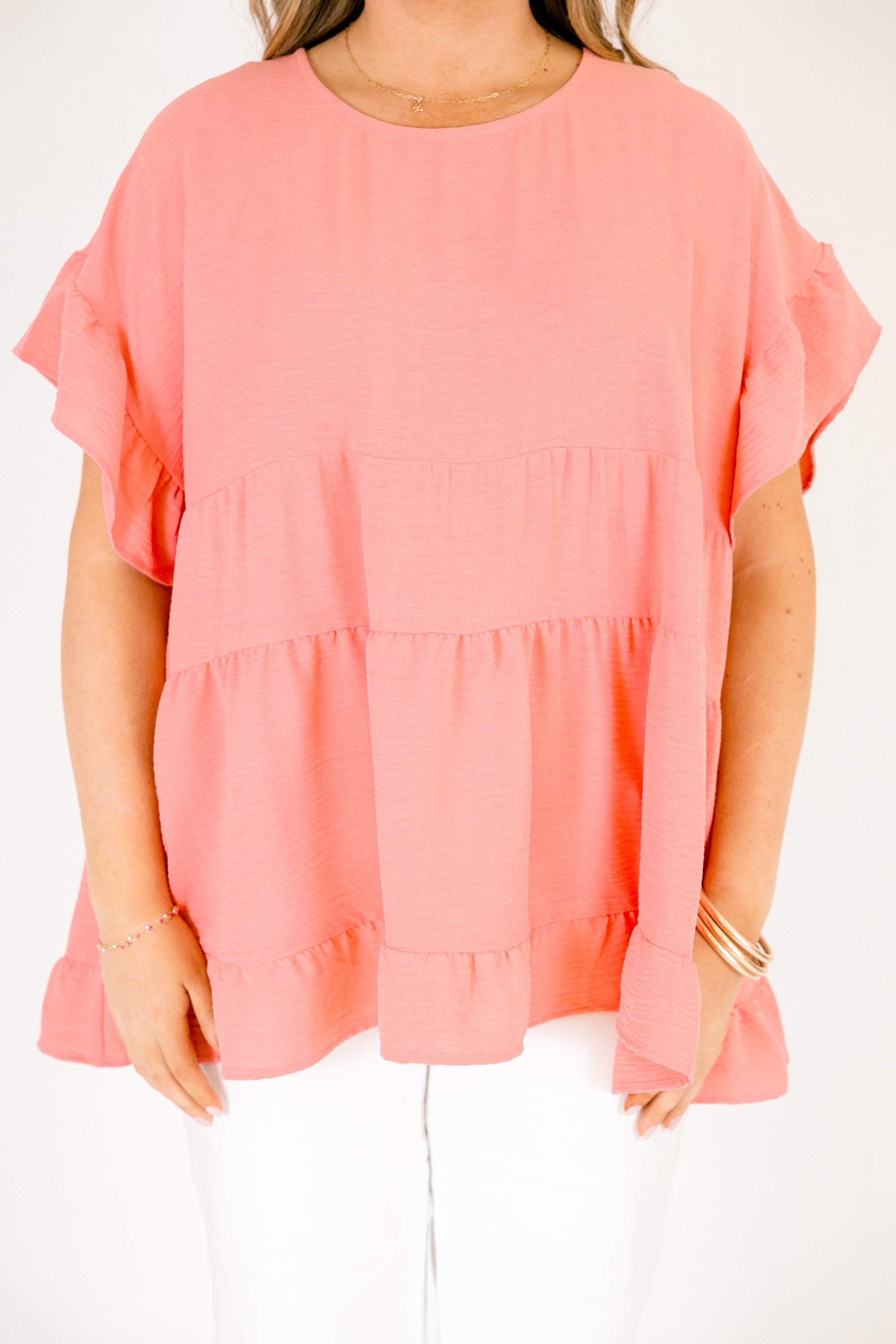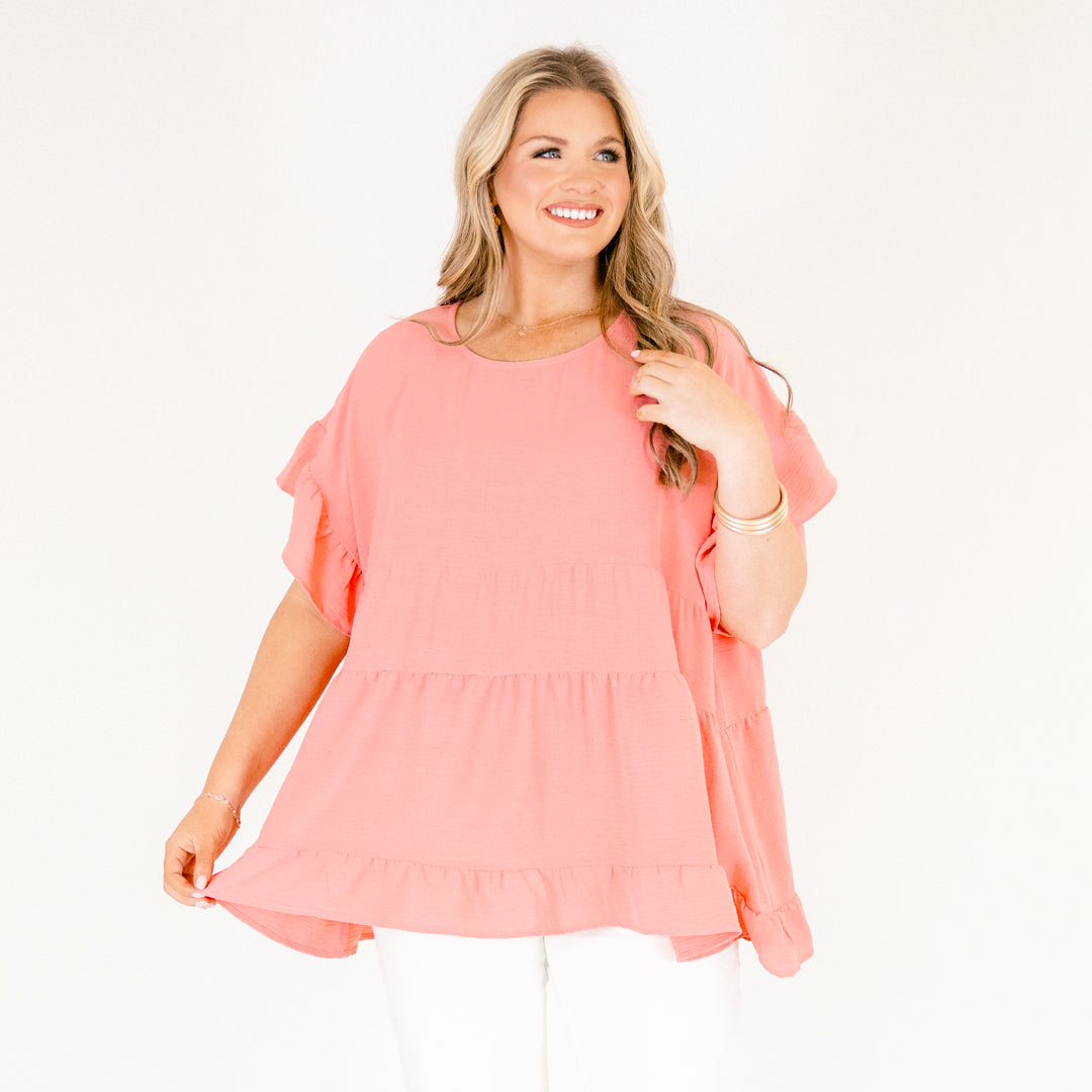 This textured tiered ruffle top is perfect for adding a touch of fun and femininity to your outfits! With back button closure and ruffle sleeves, it’s easy to pair with your favorite white denim and sandals! Elevate your look with this pink top and stand out from the crowd!