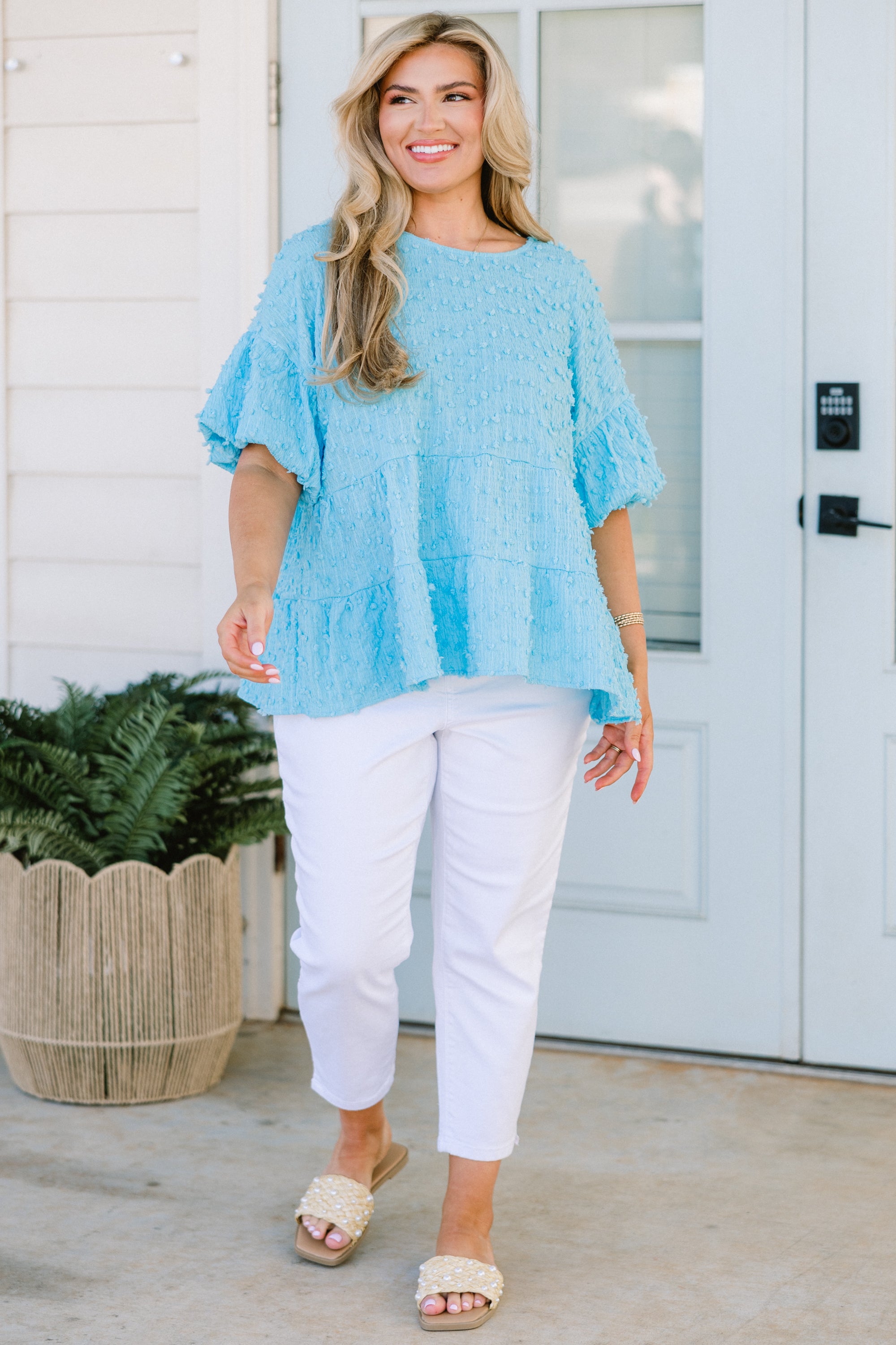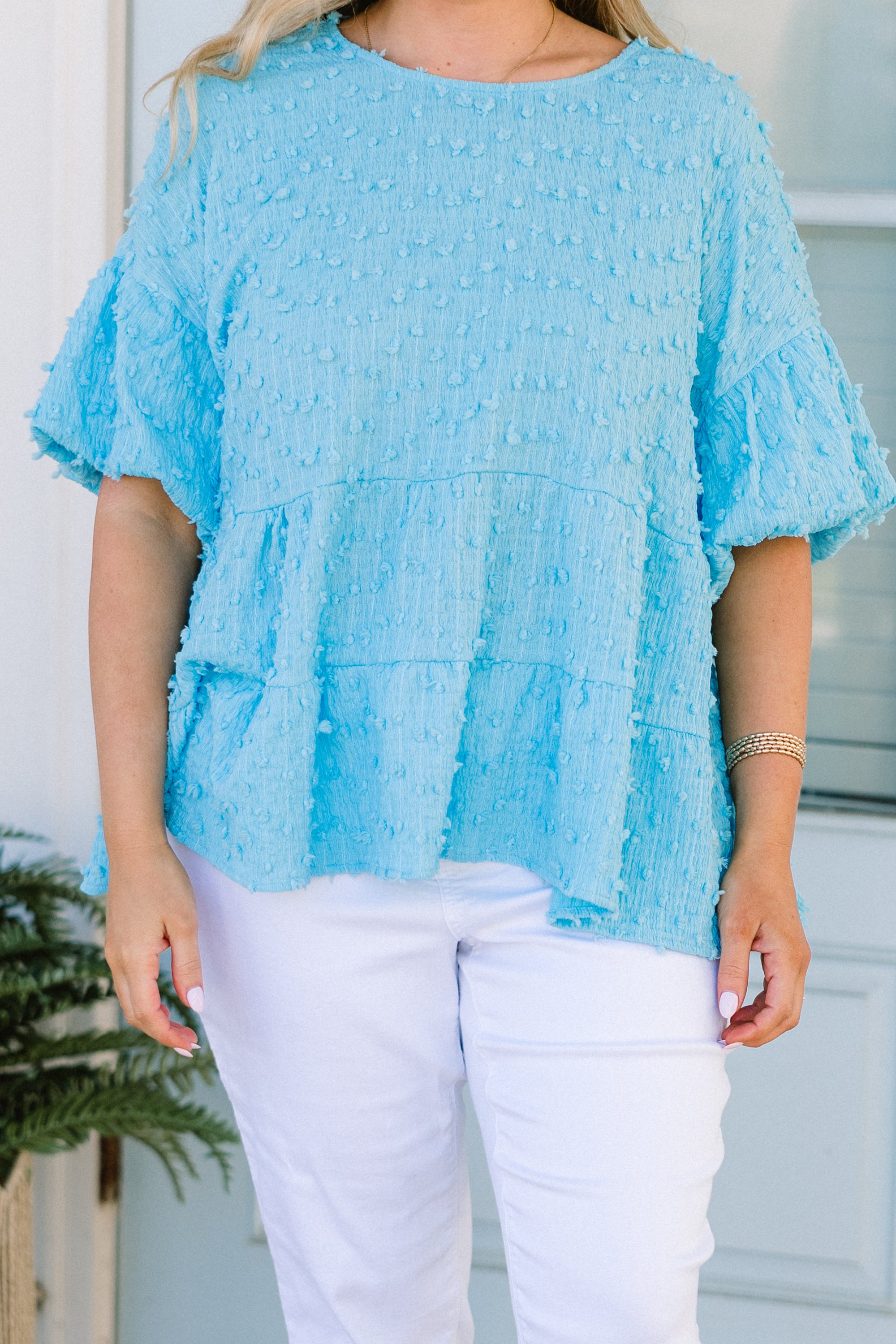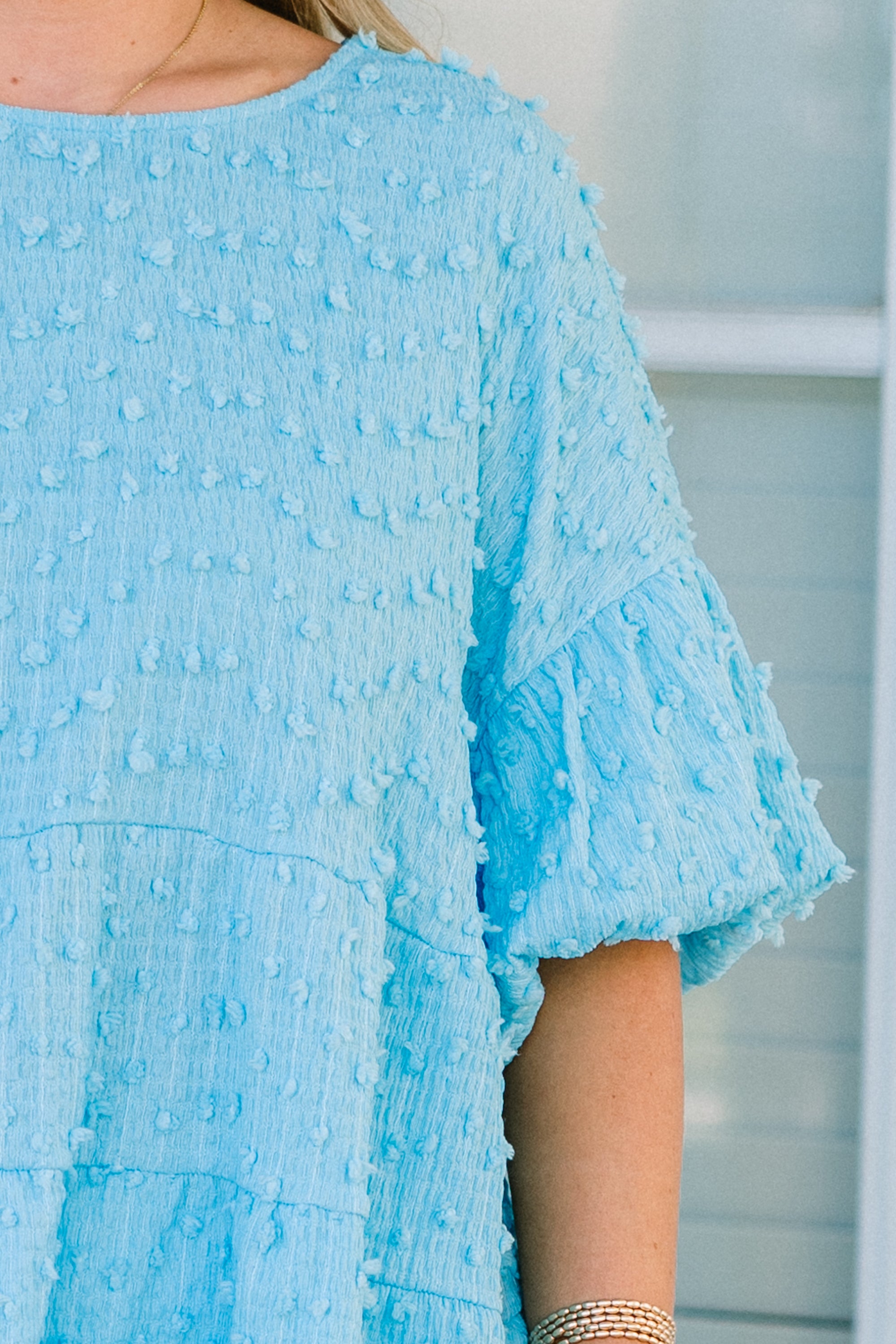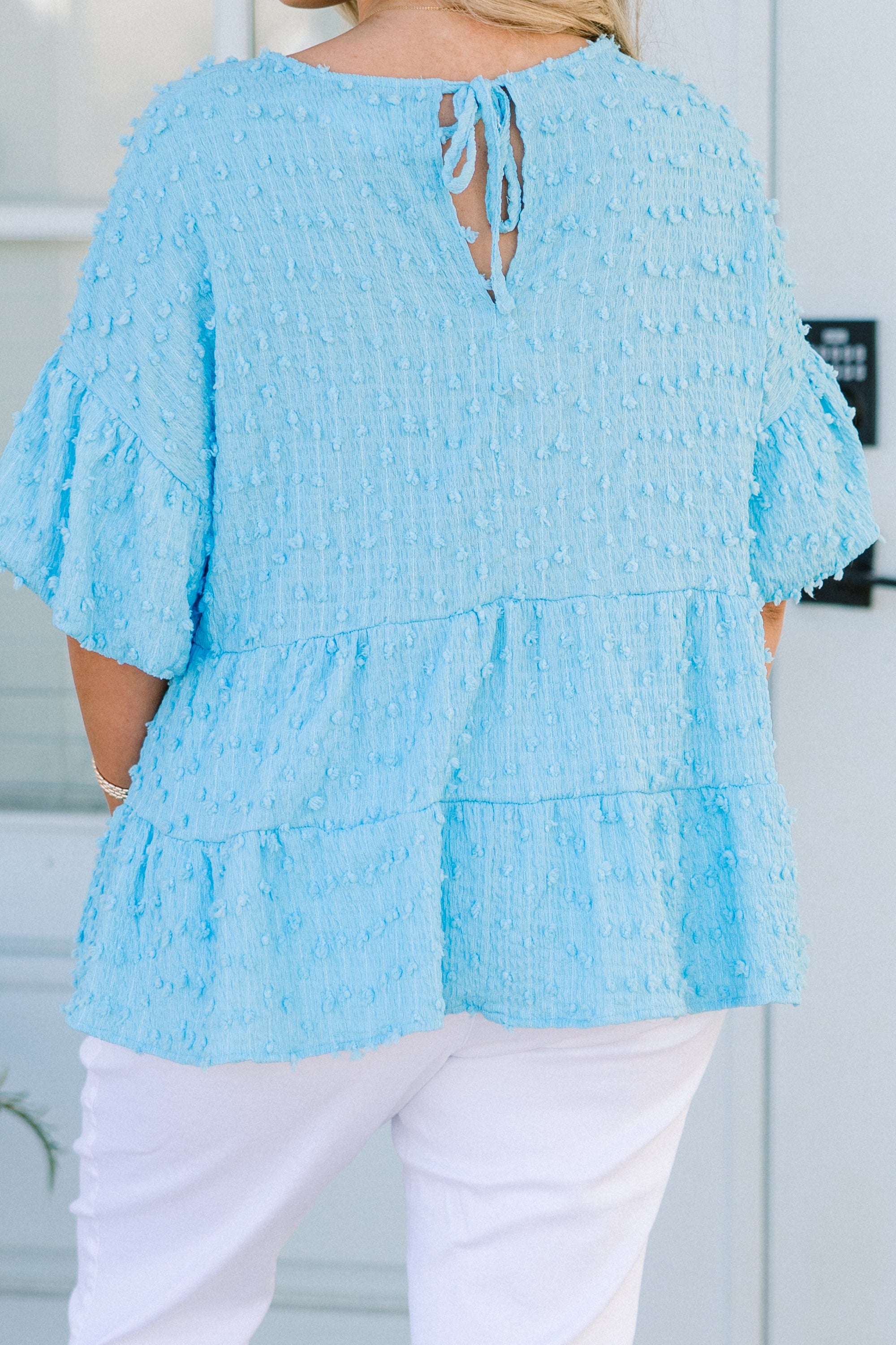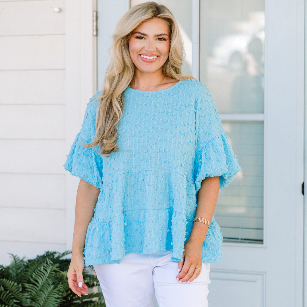Elevate your style with this lovely top in a classic blue color! The swiss dot pattern adds a touch of elegance, perfect for a brunch date or a day out on the town! Upgrade your wardrobe and exude confidence with this versatile piece!