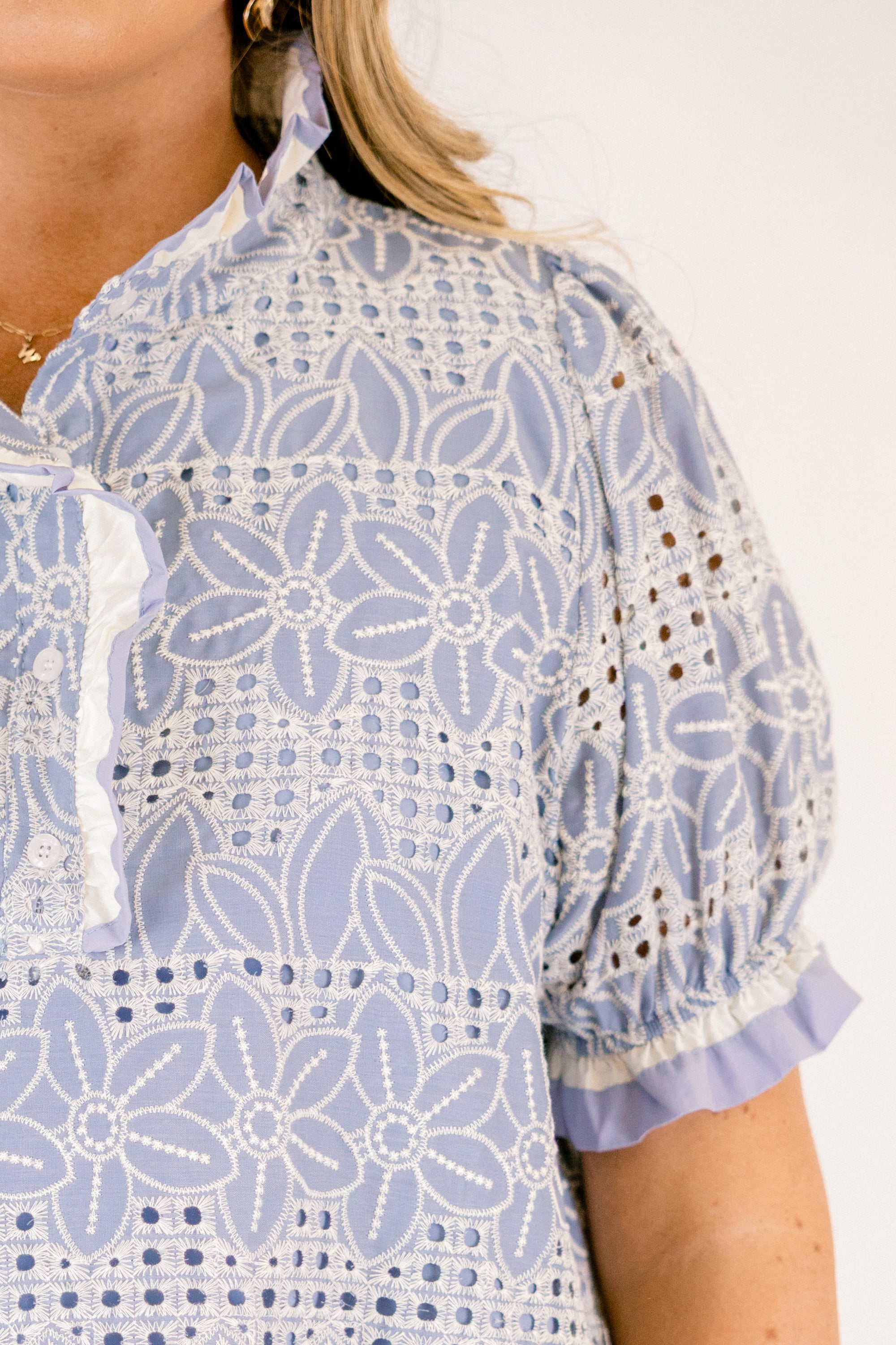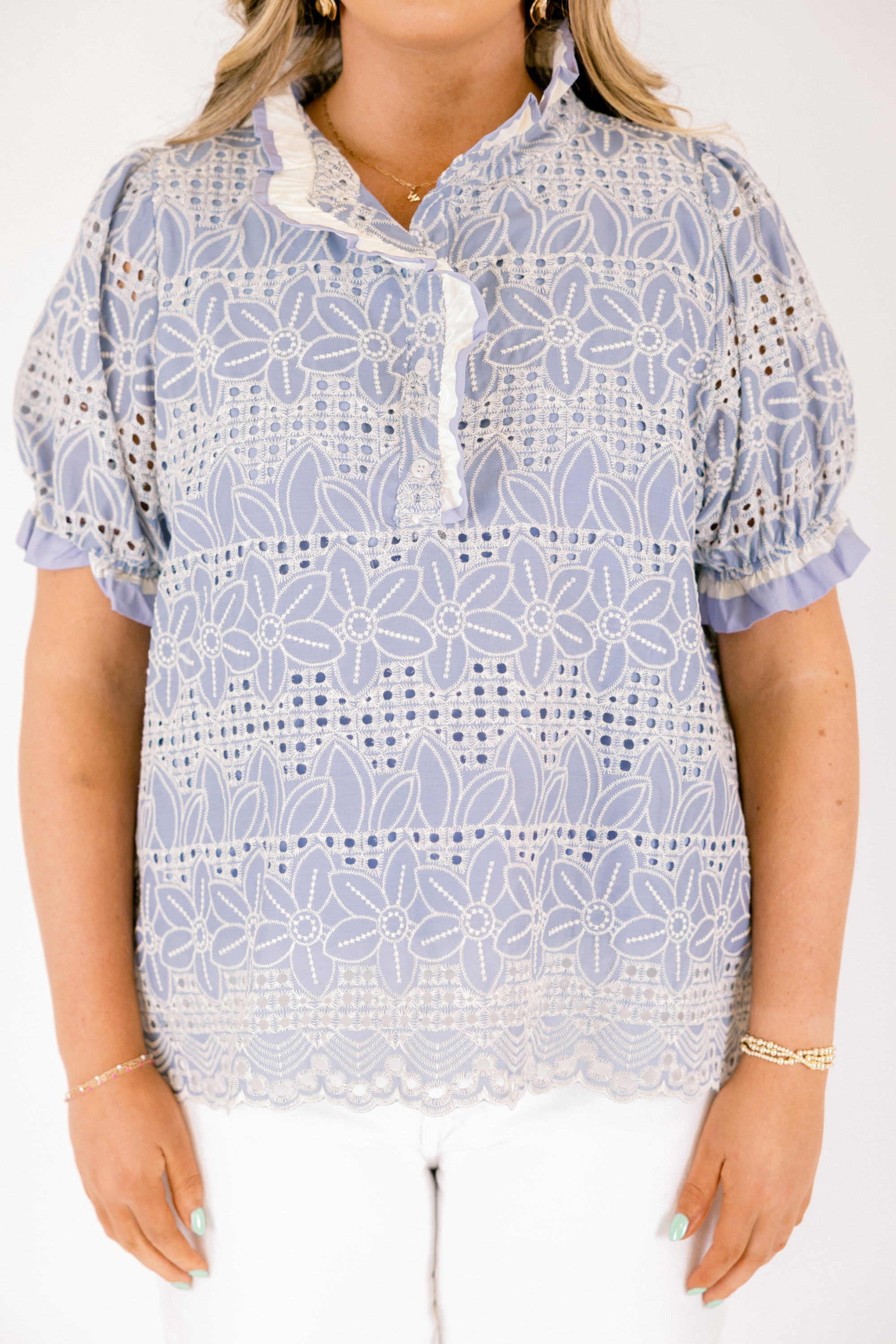 Elevate your everyday wardrobe with this charming chambray top featuring a delicate eyelet design and romantic ruffled neckline. The soft, breathable fabric in a lovely chambray hue makes it perfect for layering or wearing solo. Whether you’re dressing up for brunch or keeping it casual, this versatile piece effortlessly transitions from day to night with timeless appeal.