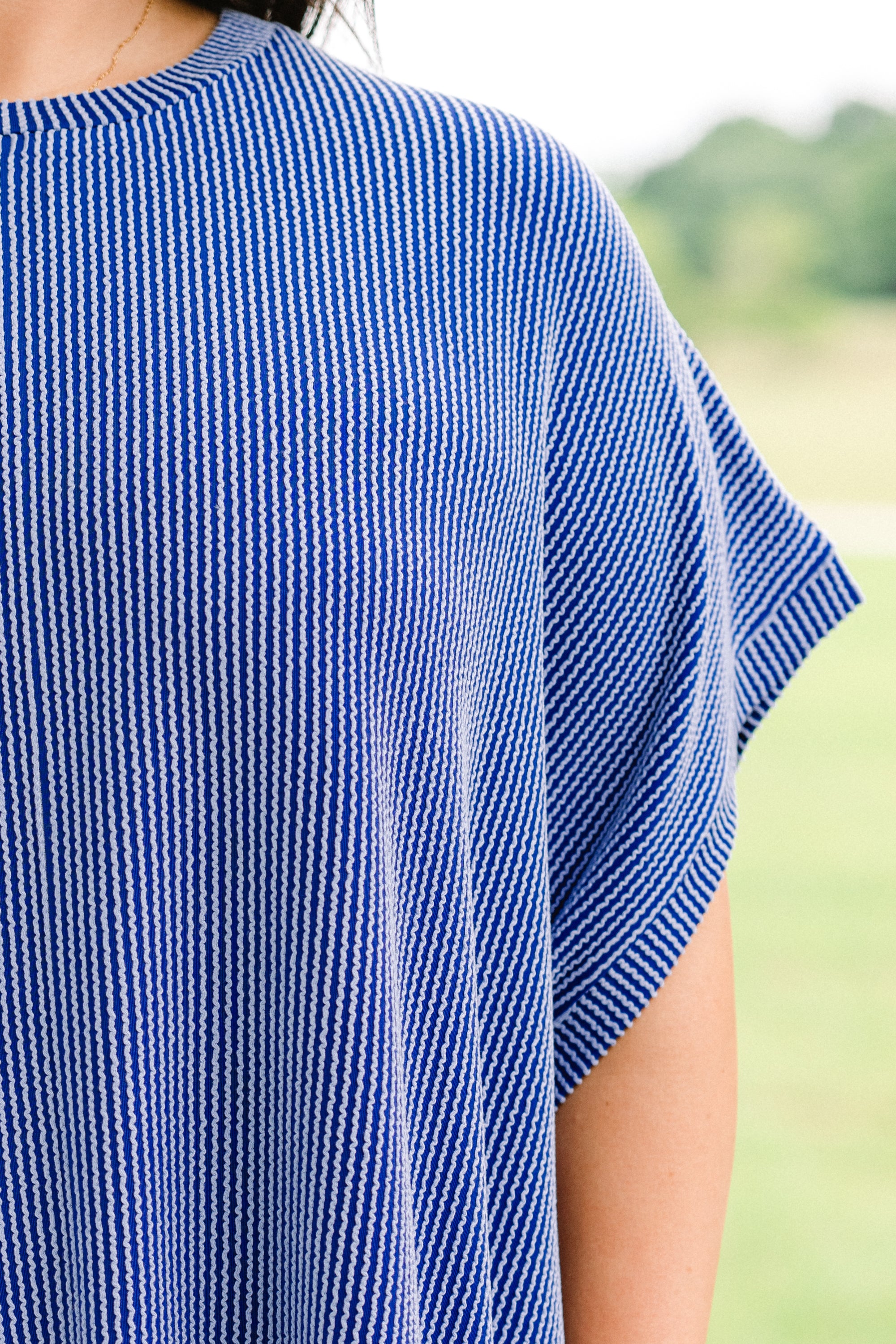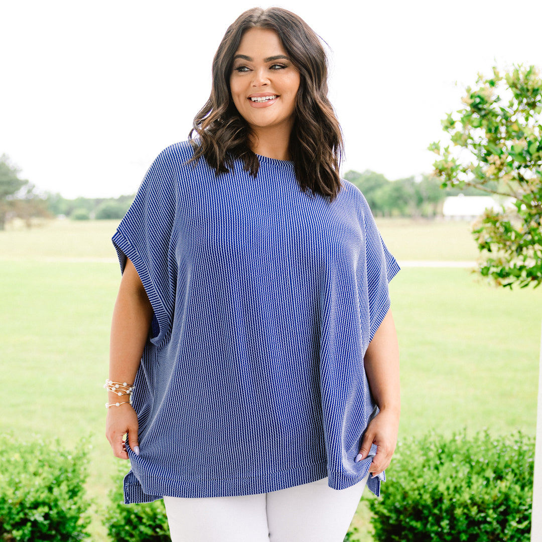 We are all about this gorgeous top! The lovely dark blue color and oversized fit is super comfy and chic! The ribbed texture and stretchy style is a must-have! Style this top with some white denim and cute accessories for a classic chic look!