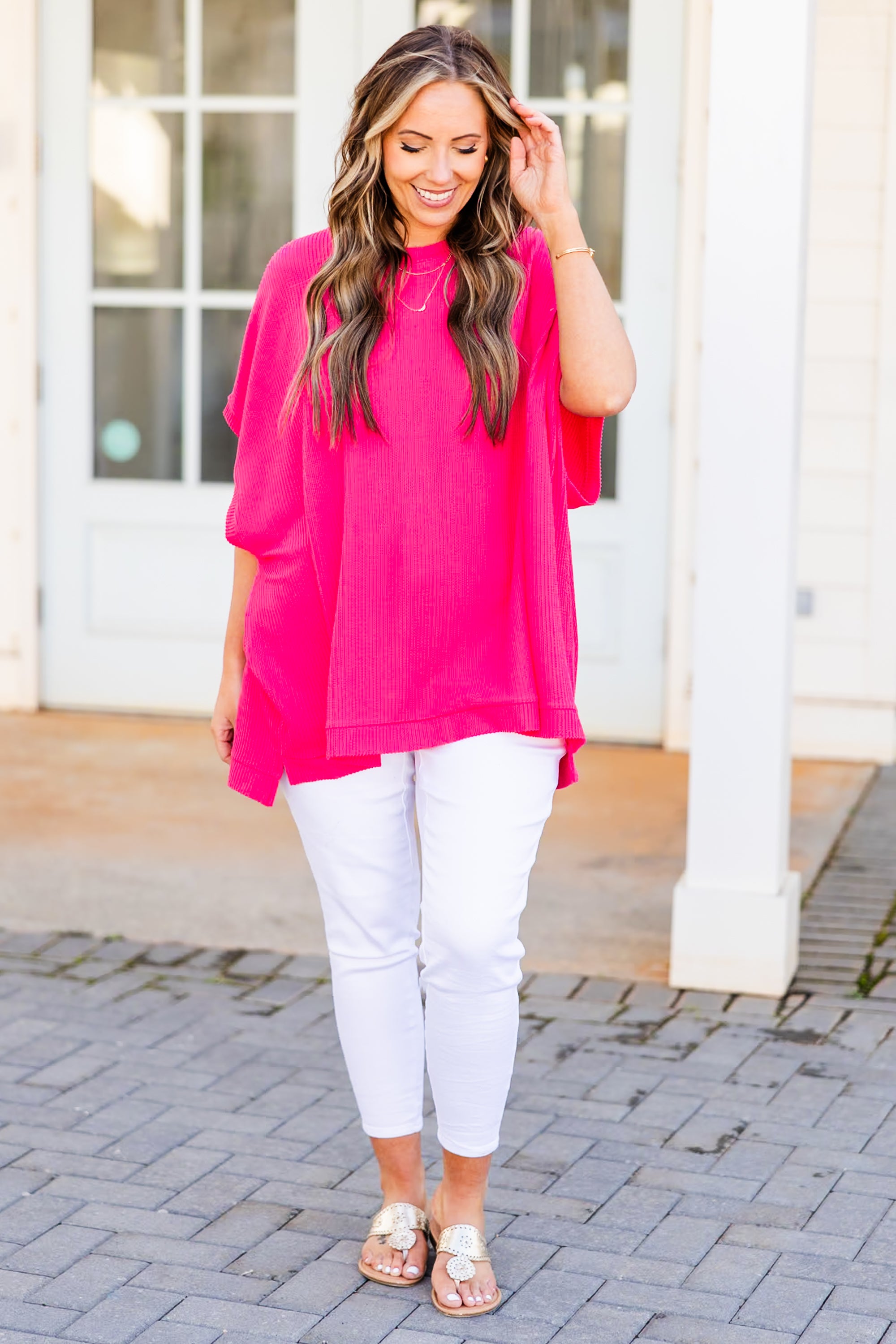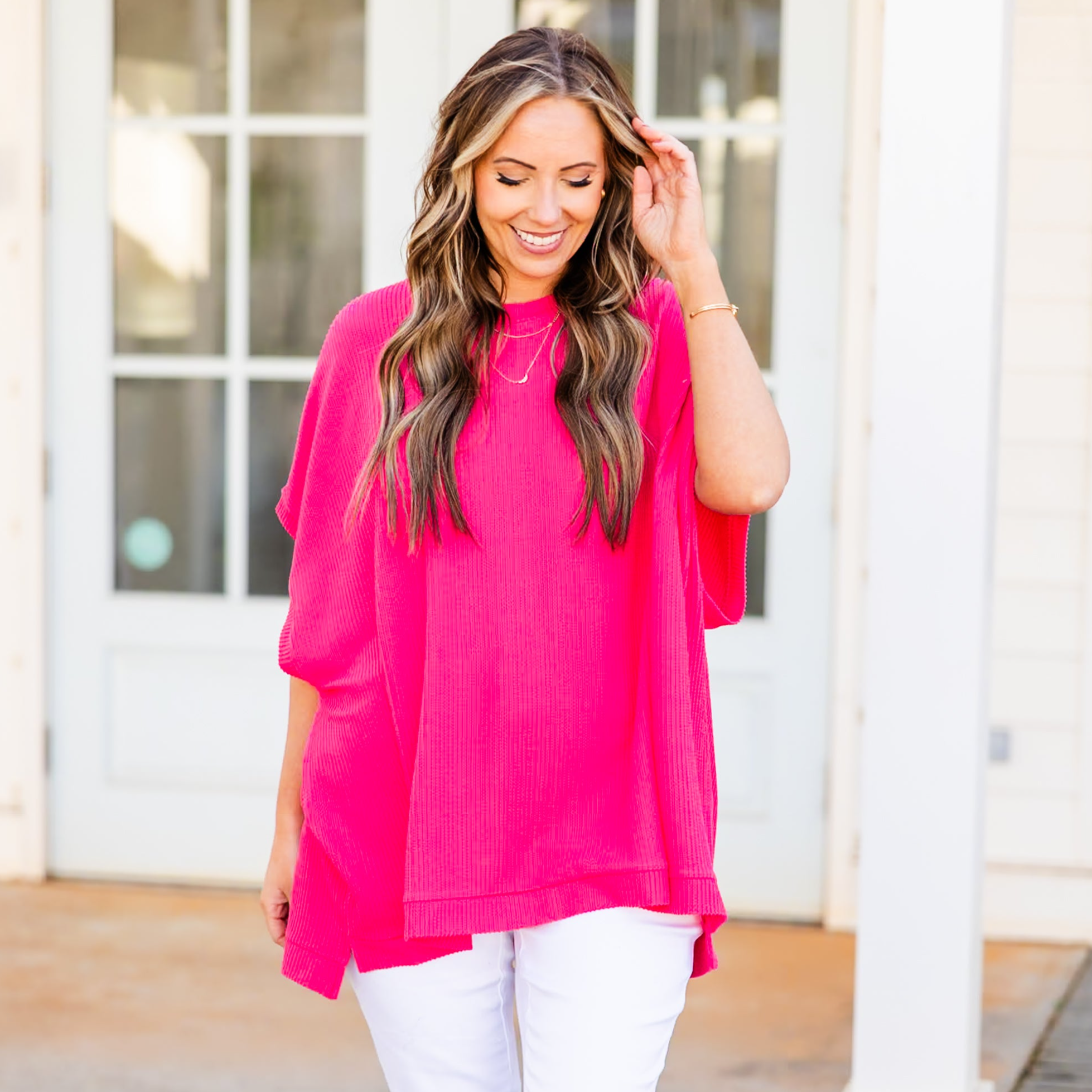 We are all about this gorgeous top! The lovely hot pink color and oversized fit is super comfy and chic! The ribbed texture and stretchy style is a must-have! Style this top with some denim and cute accessories for a classic chic look!