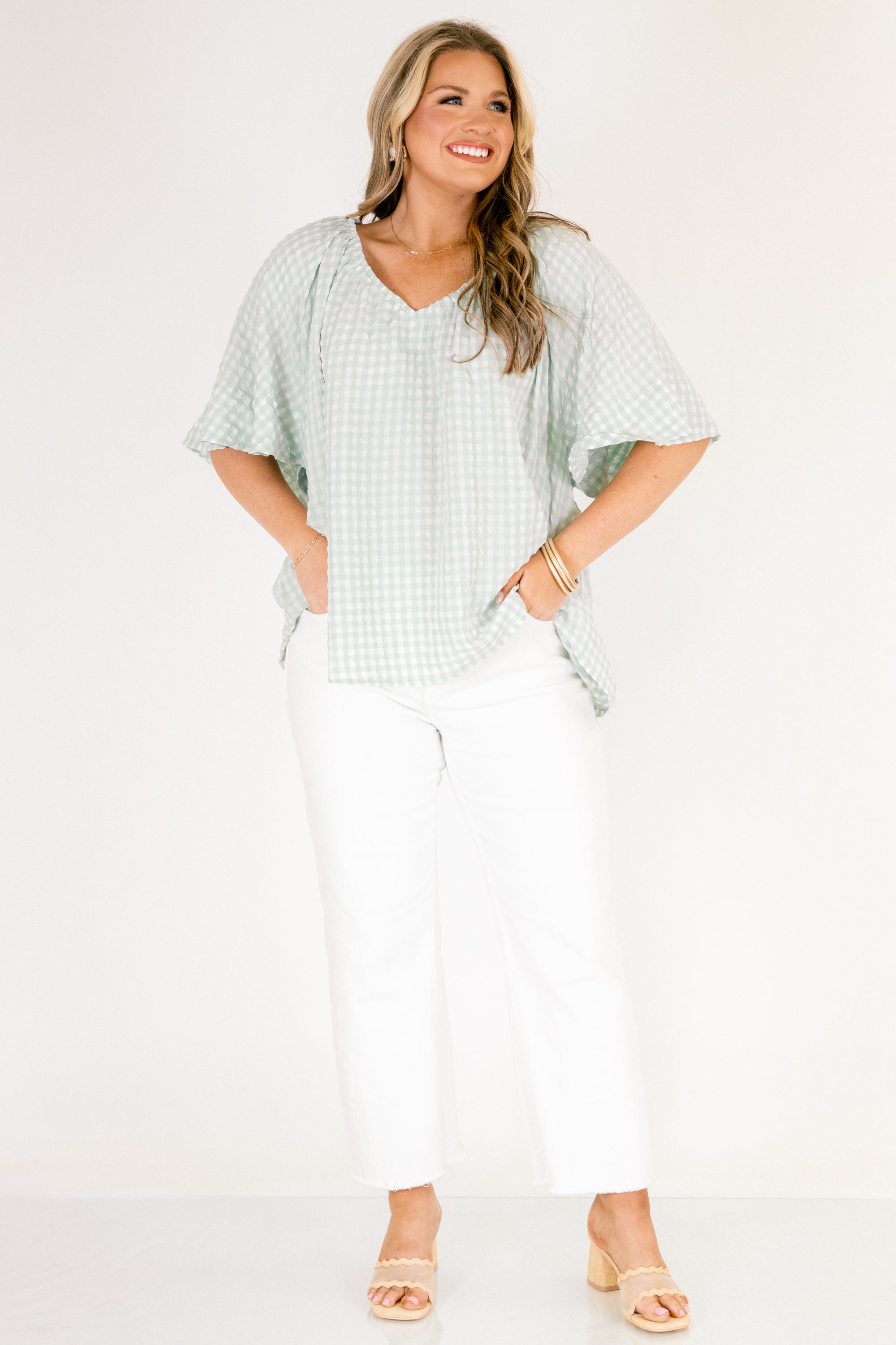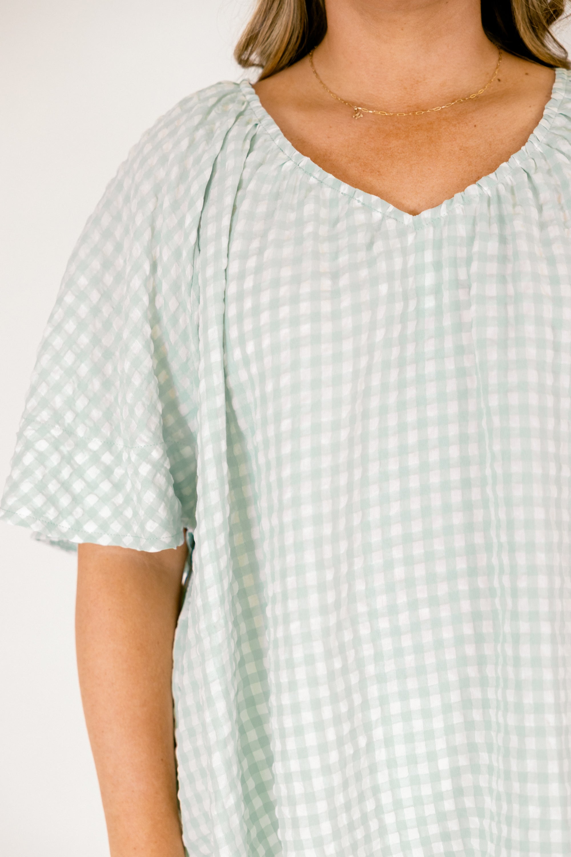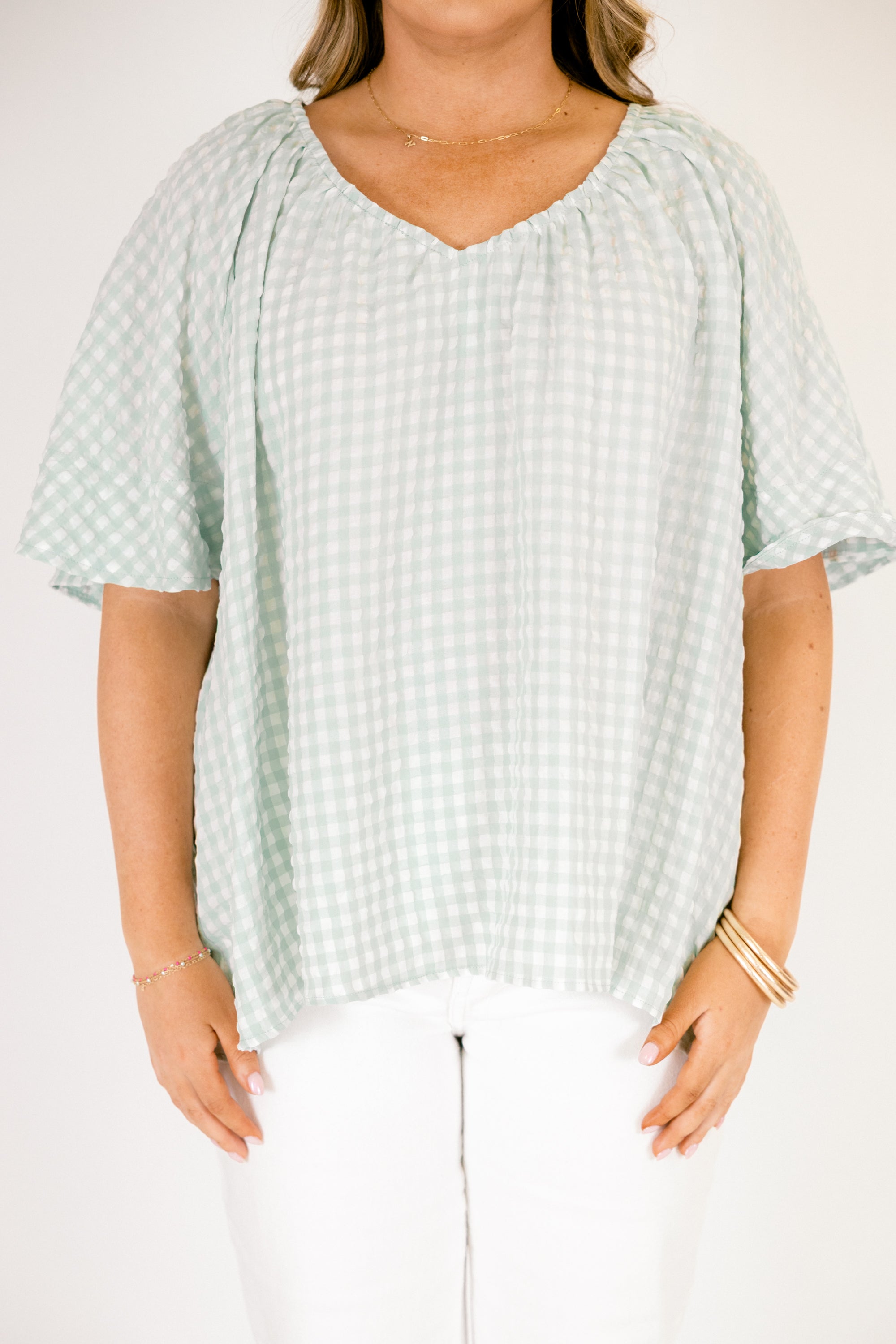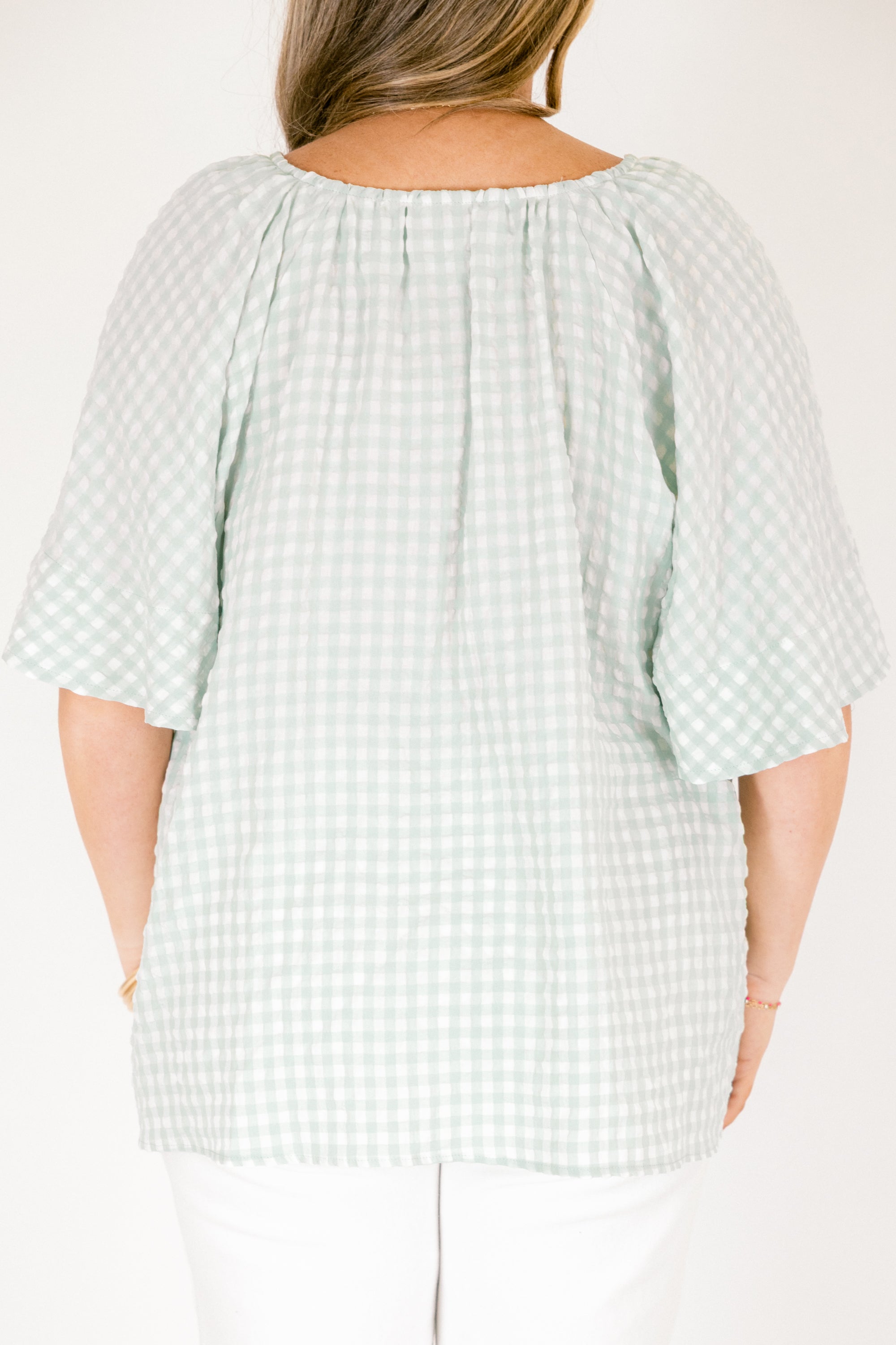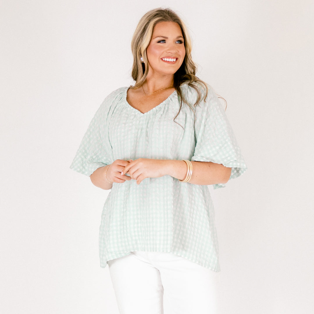 Effortless style meets timeless charm with this turquoise top! The classic checked pattern brings a touch of vintage-inspired flair to your everyday wardrobe, while the relaxed fit keeps things comfortable and breezy! Perfect for pairing with jeans, skirts, or shorts, this versatile piece transitions seamlessly from casual outings to laid-back weekends! A wardrobe essential that proves simple patterns never go out of style!