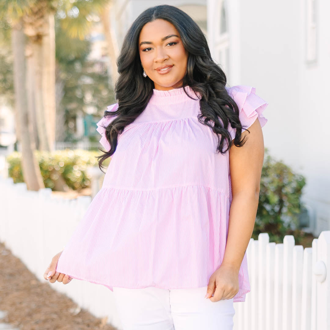 Grab this beauty right now before it’s too late! Featuring a stunning pink stripe pattern in a lovely cream color, this top is perfect for any occasion! Its flutter sleeves add a touch of femininity, making it a versatile piece for both the office and a night out! Elevate your wardrobe with this must-have top!