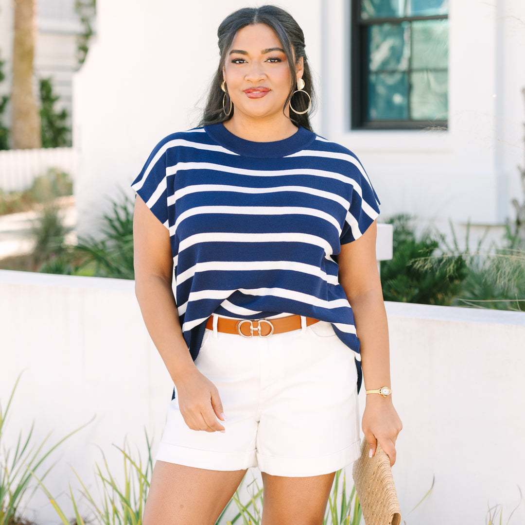 Stripes meet softness in this short-sleeve sweater that’s ready to become your go-to layer! The navy palette plays well with everything in your closet, while the relaxed fit keeps things comfortable all day long. Perfect for those moments when you want a little extra warmth without the bulk. Throw it on and feel instantly put-together!