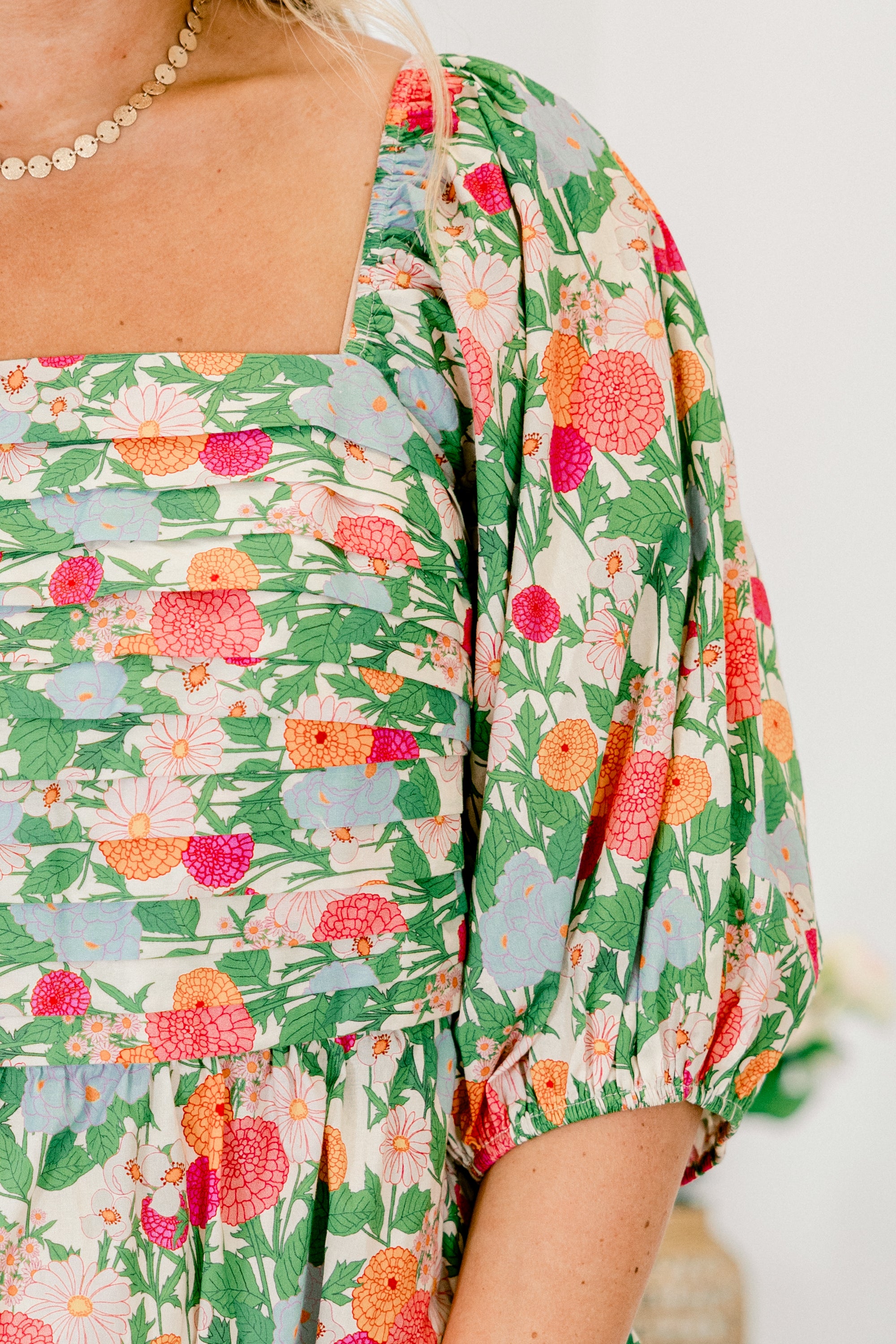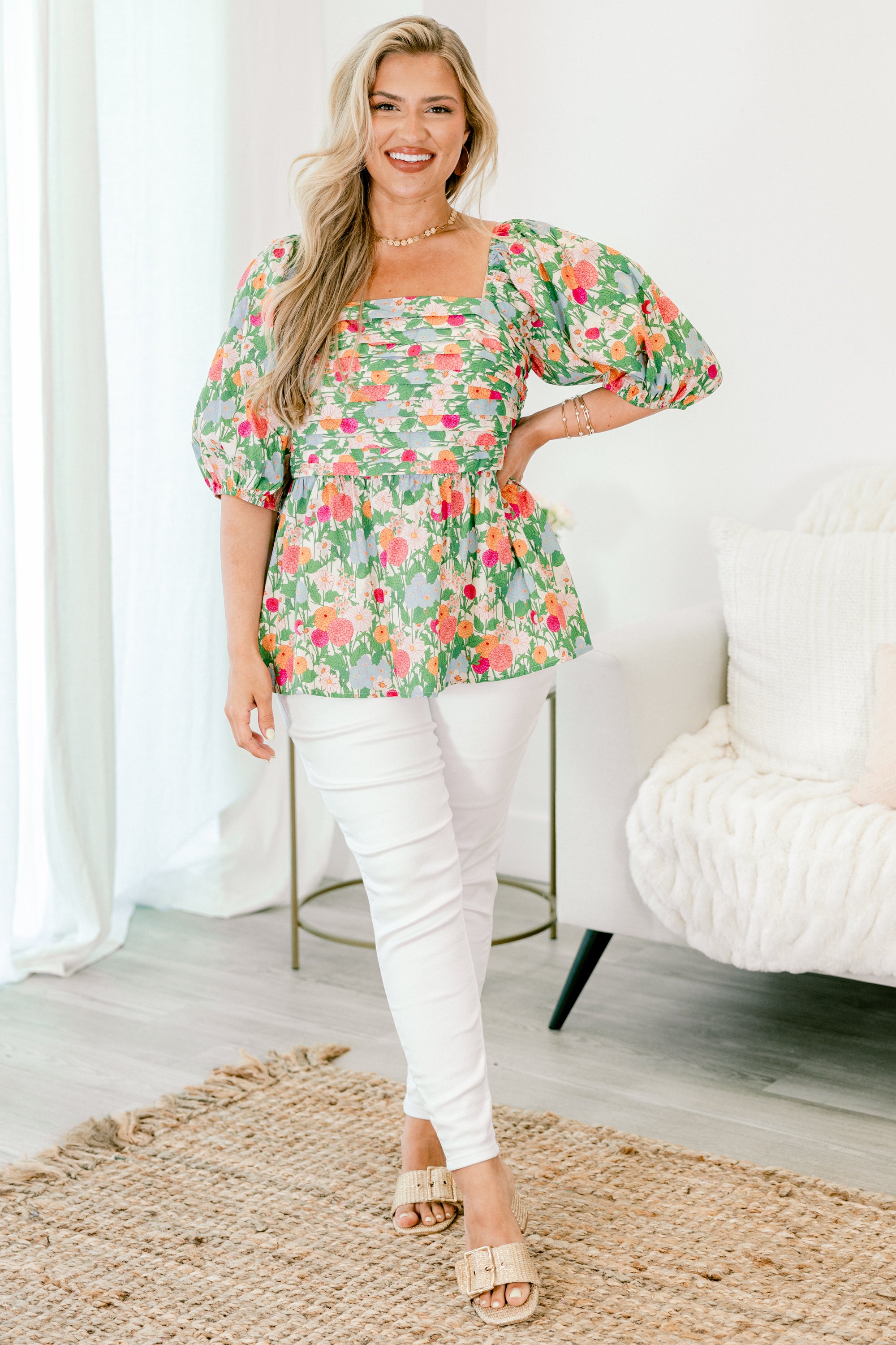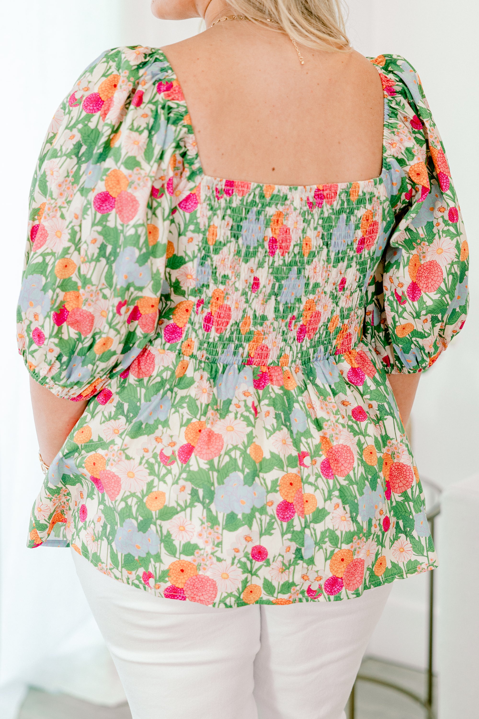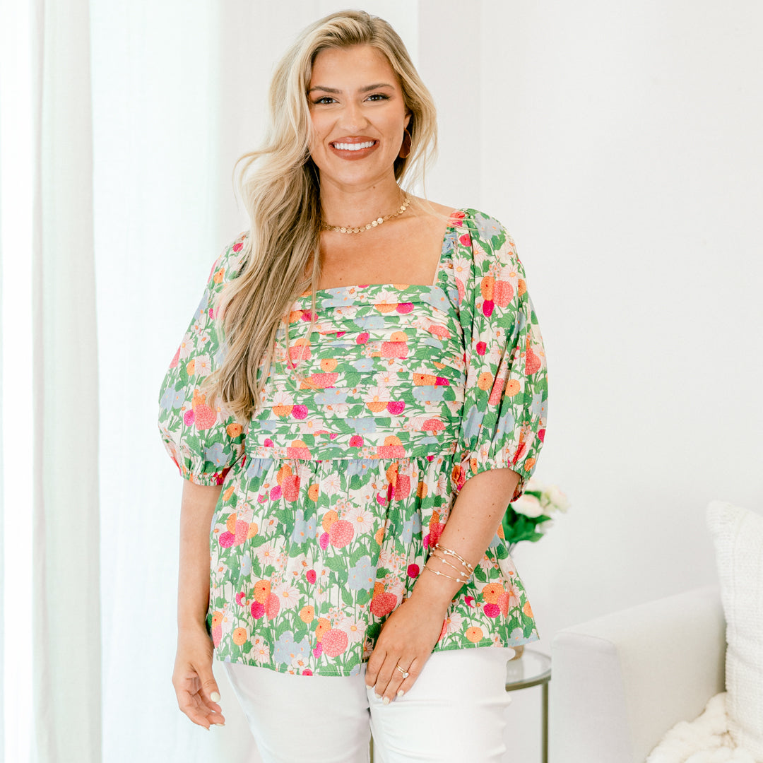 Dance through your day in this top in vibrant green! This playful piece showcases a charming floral print that catches every eye! The square neckline and pleated bust create a flattering frame, while bouncy elastic puff sleeves add a dash of fun! Its peplum babydoll silhouette flows with your movements and the smocked back ensures a comfortable, perfect fit! Bloom with confidence in this delightful top!