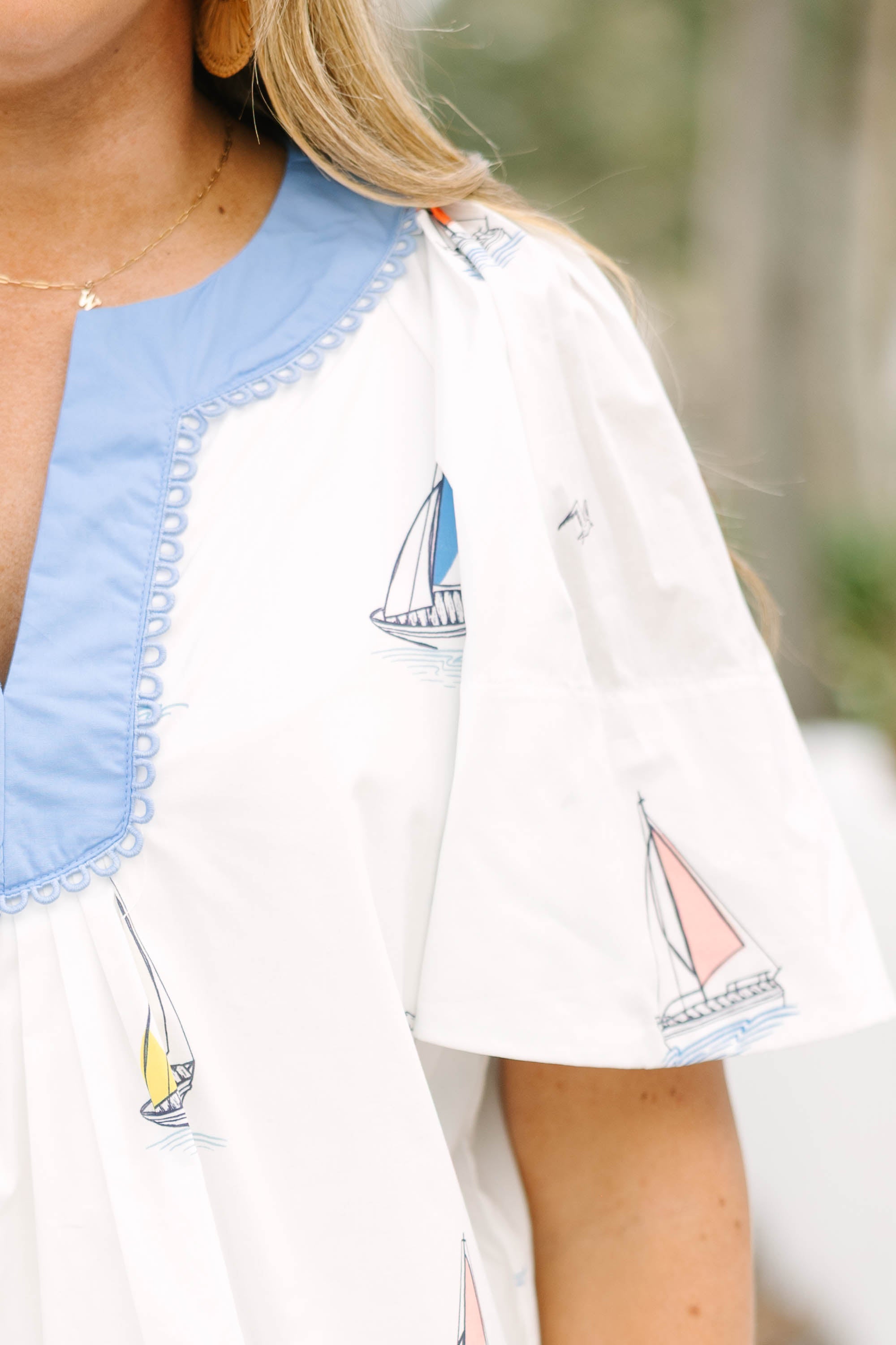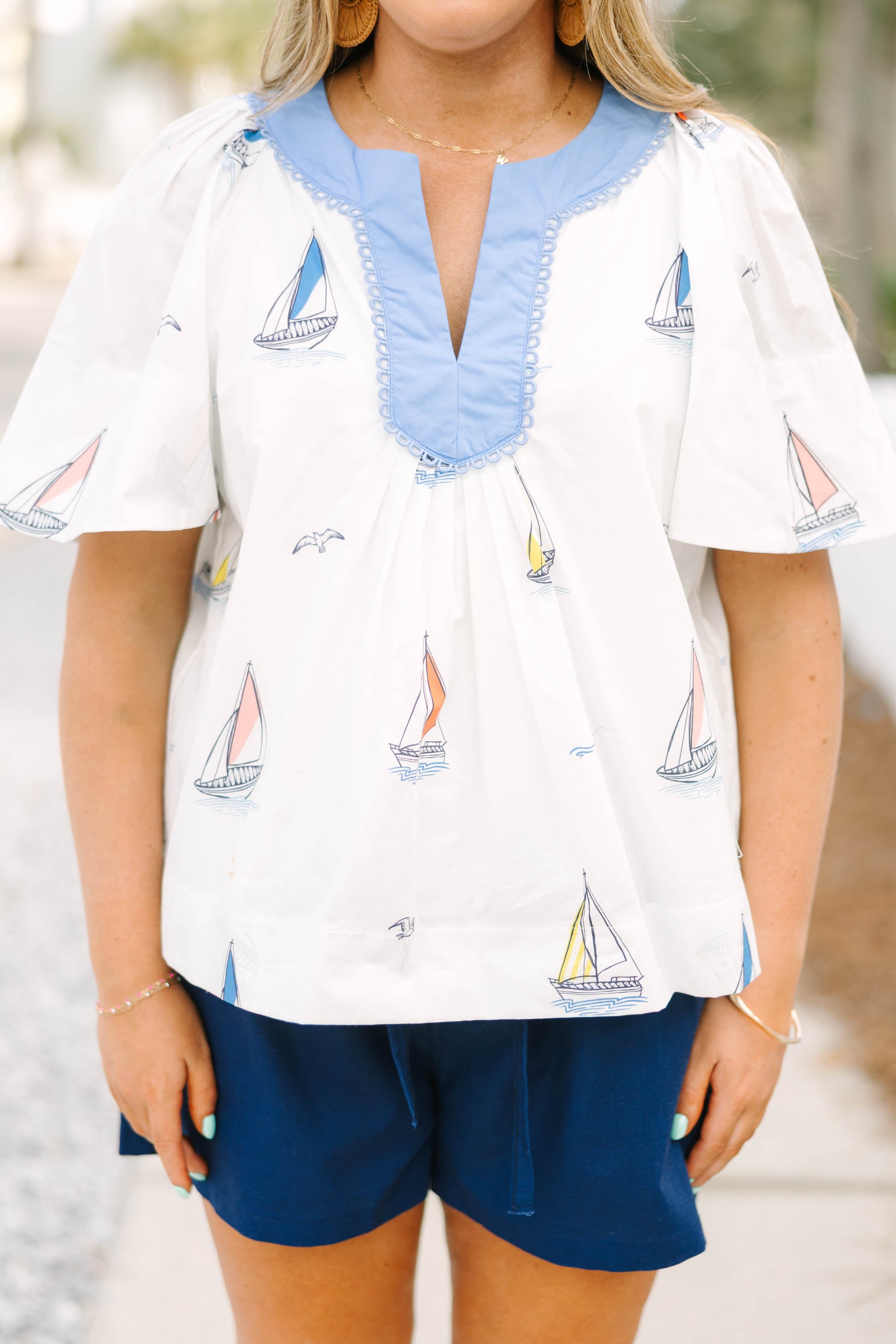 Embrace a touch of elegance with this top in white! Featuring a split v-neckline, sailboard print fabric, short flutter sleeves and delicate pleated detailing, this top exudes sophistication and charm! Perfect for any occasion, it’s a must-have addition to your wardrobe!