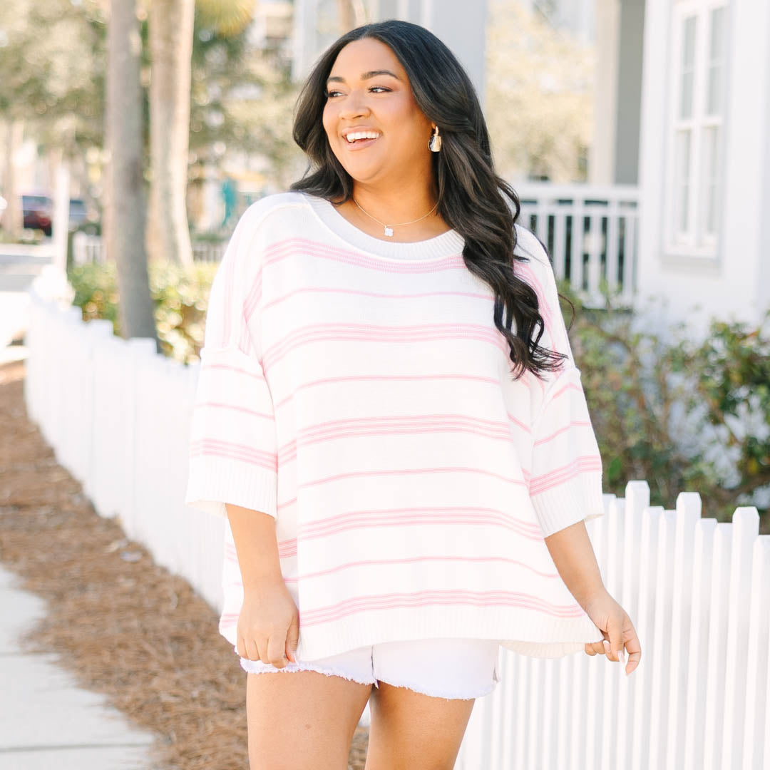 Effortless style meets comfort in this striped sweater, featuring relaxed drop shoulder sleeves and a short sleeve cut perfect for layering or wearing solo! The classic pink and white stripe pattern adds visual interest while remaining versatile enough to pair with your favorite denim or trousers! Ideal for transitional seasons or casual everyday wear, this piece brings a timeless appeal to any wardrobe!